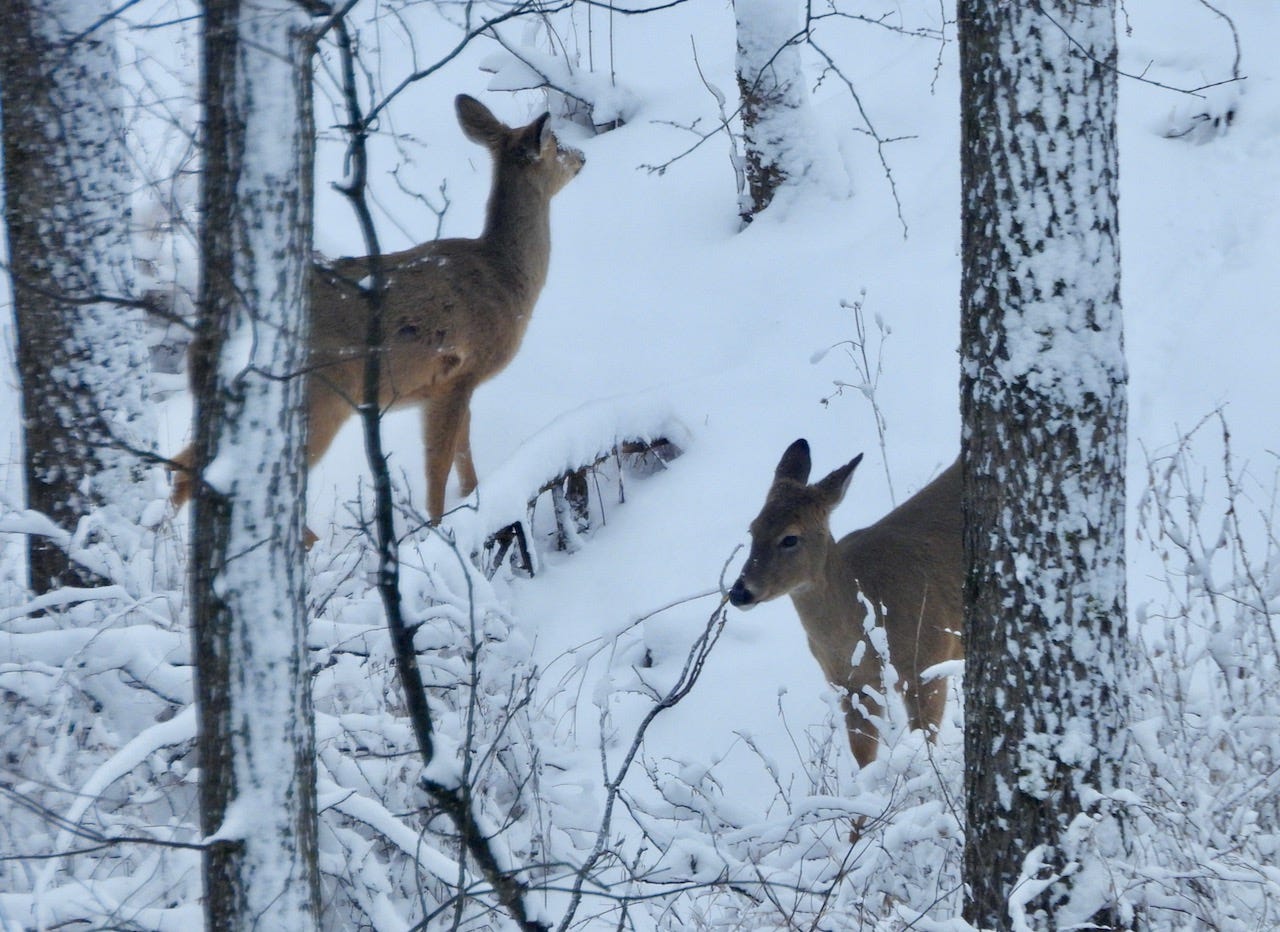 Daytime finds the deer bedded on the wooded hillside out of the wind. At night, they snoop around our compost pile, hoping for some tasty carrot peelings, apple cores, or banana peels.