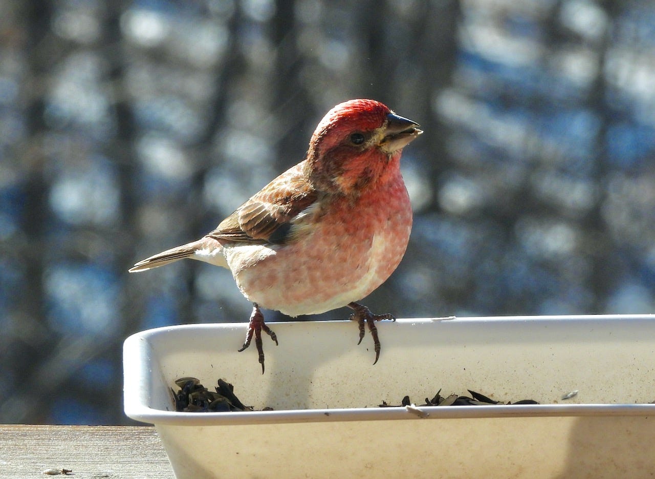 A couple of pairs of purple finches sometimes mingle with the more common winter birds, seemingly in no hurry to wander back north to the coniferous forests where they breed.