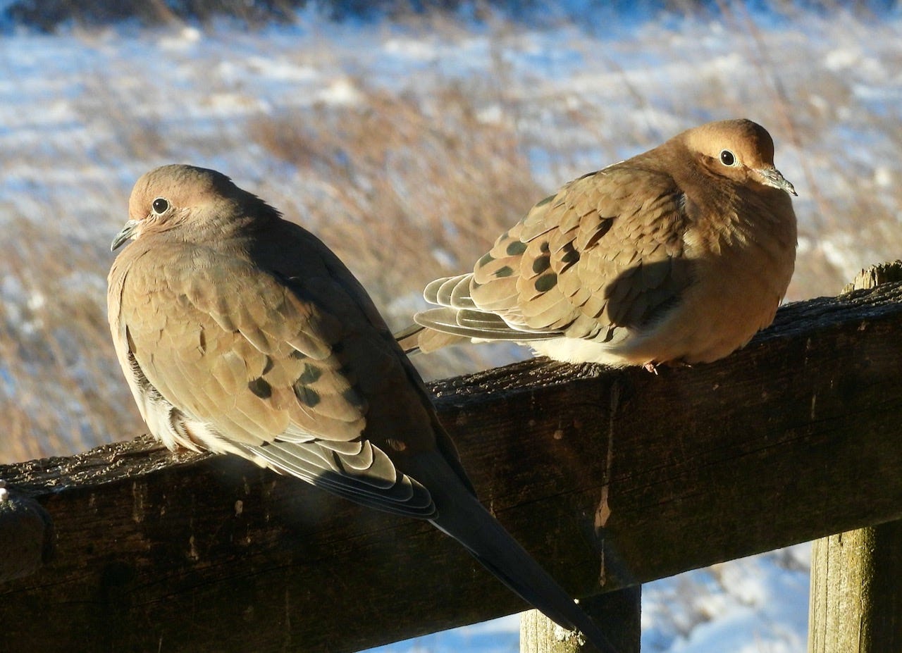 The next morning, our half-dozen lingering mourning doves puff up their feathers in an attempt to stay warm as they wait in line for a breakfast of sunflowers hearts from the feeder on our deck. Are they wondering why they didn’t migrate south in the fall, as most of their clan typically do?