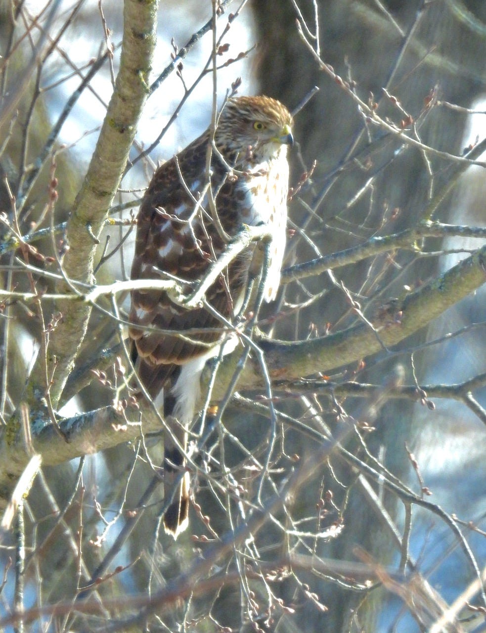 But ALL those birds should keep an eye out for the sharp-shinned hawk that periodically darts through the trees in search of a feathered meal. We thrill to see the sleek raptor, and we might gladly share one of our countless goldfinches with the hungry sharpie – but we hope the little accipiter won’t decide to munch a cute chickadee!