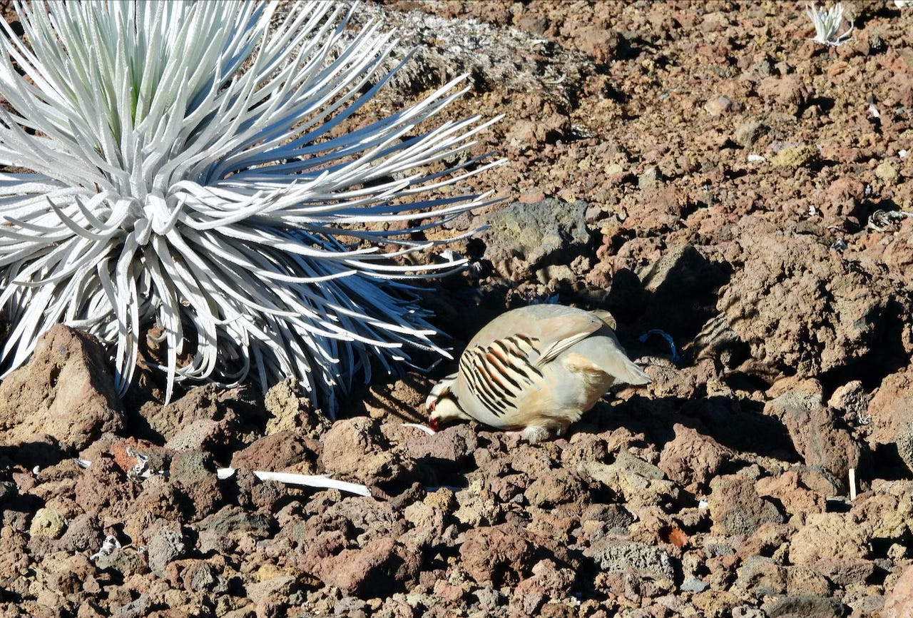 The interface between the invaders and native Hawaiian species is striking. Chukars wandered the summit of Haleakala National Park, and pecked for insects near the spiney rosettes of Haleakala silversword, a stunning succulent plant endemic to the harsh, lava slopes of the volcano. Silversword, which may live up to 90 years before it flowers and dies, is listed as threatened because tourists used to collect the rosettes as souvenirs, and livestock sometimes grazed on the leaves.