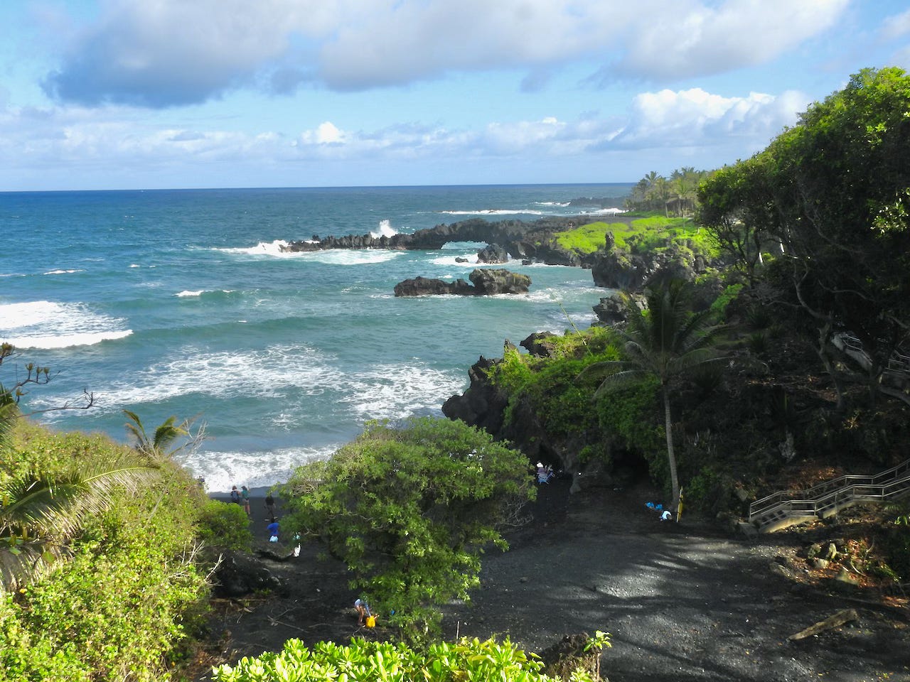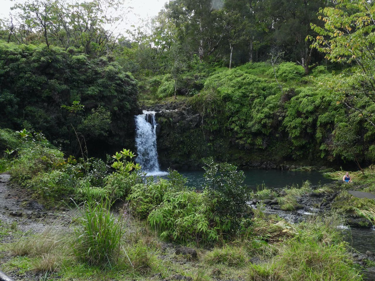 Having driven Iowa’s back roads all my life, I was unfazed by warnings about the narrow, steep, twisting road. Steering the truck around the countless switchbacks proved to be good therapy for my aging arm and shoulder muscles. We slowed or stopped for glimpses of waterfalls cascading through the rain forest. A spectacular overlook emphasized the power of the Pacific, with huge waves crashing into the lava boulders along the beach.