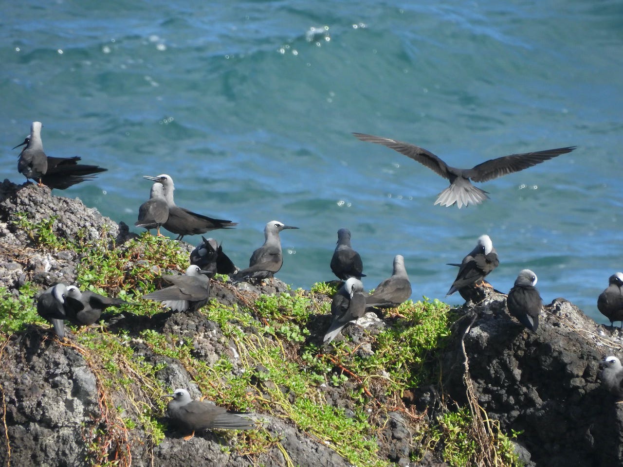 At Wai’anapanapa State Park on Maui, a colony of black noddy, Noio, entertained us with their antics on a nesting rock in a shallow bay. Whitecaps from the ocean splashed on a black sand beach.